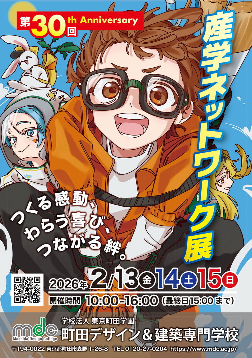 産学ネットワーク展は、当校の掲げる〈ものづくり&ひとづくり〉の要となる〈産学連携〉の発表の場として、また学生活動の集大成となる【卒業制作展】として毎年2月に開催される一大イベントです。会場では学生たちによる模擬店や作品販売のほか、外部から団体を招いての特別プログラムも予定しておりますのでふるってご参加ください。